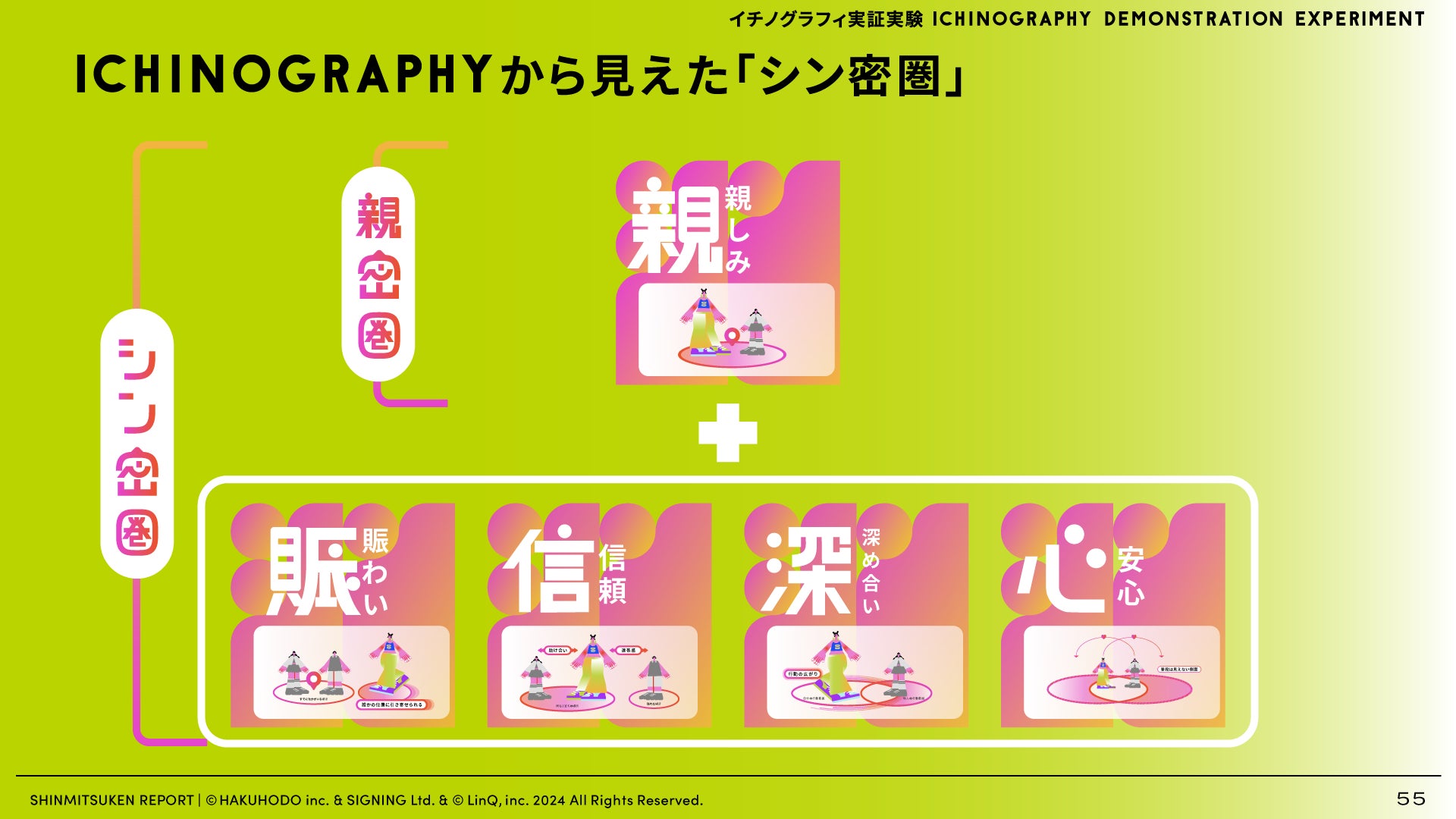 本プロジェクトでは、「つながり」に関する実態把握を目的とした、全国の10~60代男女対象のWeb定量調査に加え、位置情報共有サービスを既に使っているユーザーのデプス調査、位置情報共有サービスを使ったことがない20~40代を対象とする実証実験を実施。位置をシェアする行動の背景にある価値観や行動の因果をエスノグラフィ視点で分析する「イチノグラフィ」という独自のアプローチを採用し、有識者へのインタビューも行いながら、「つながり」「シン密圏」について考察・提言しています。