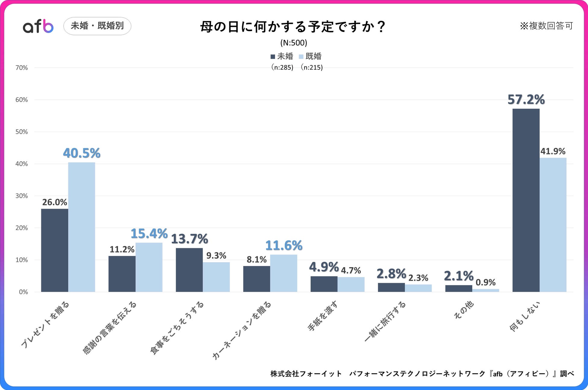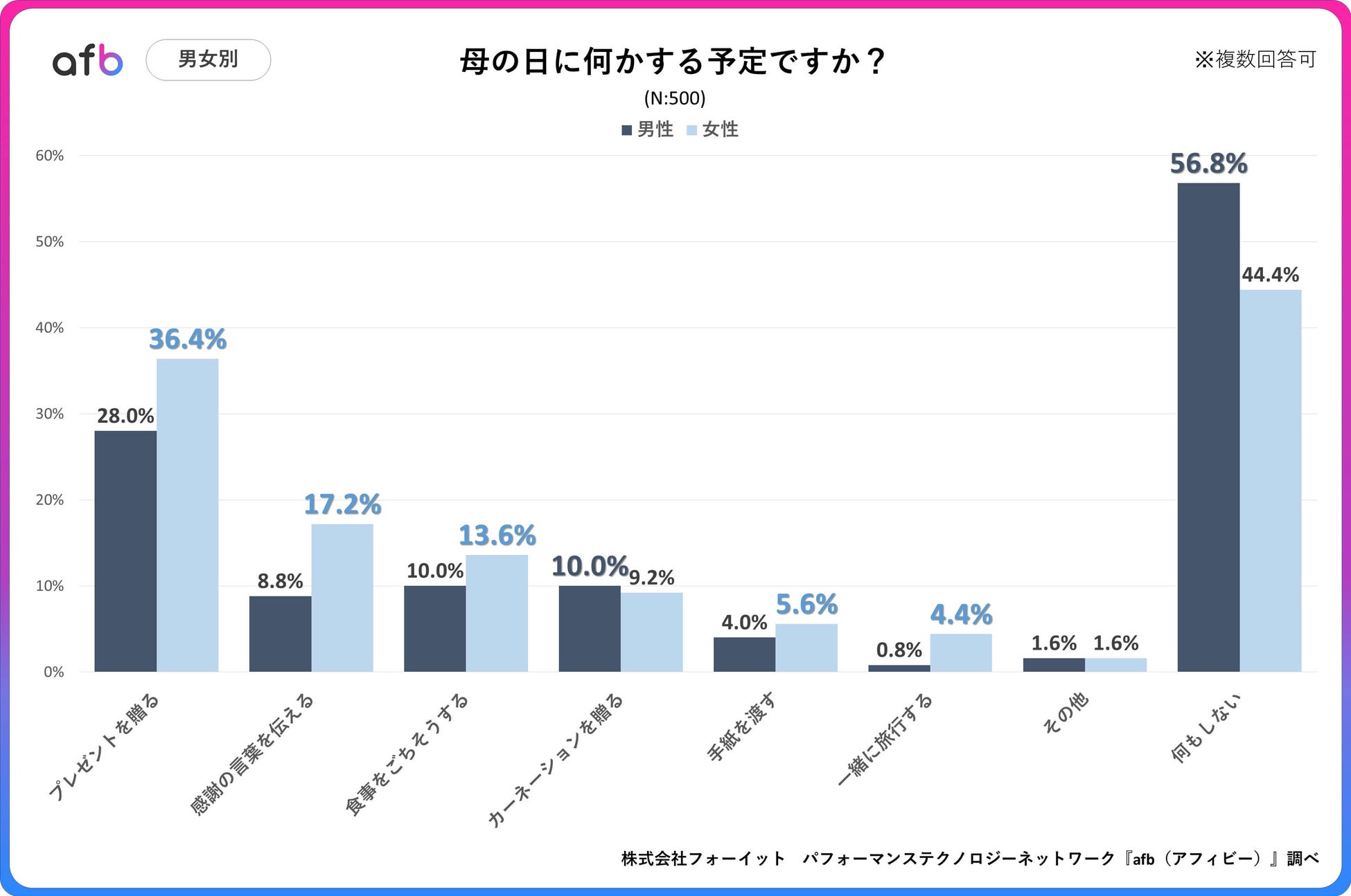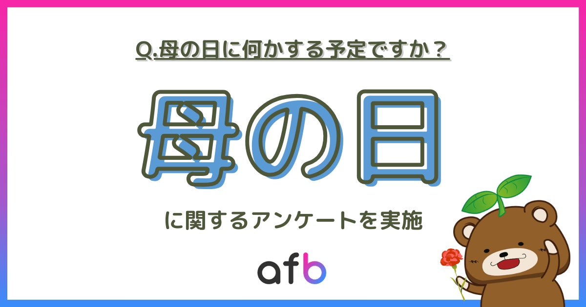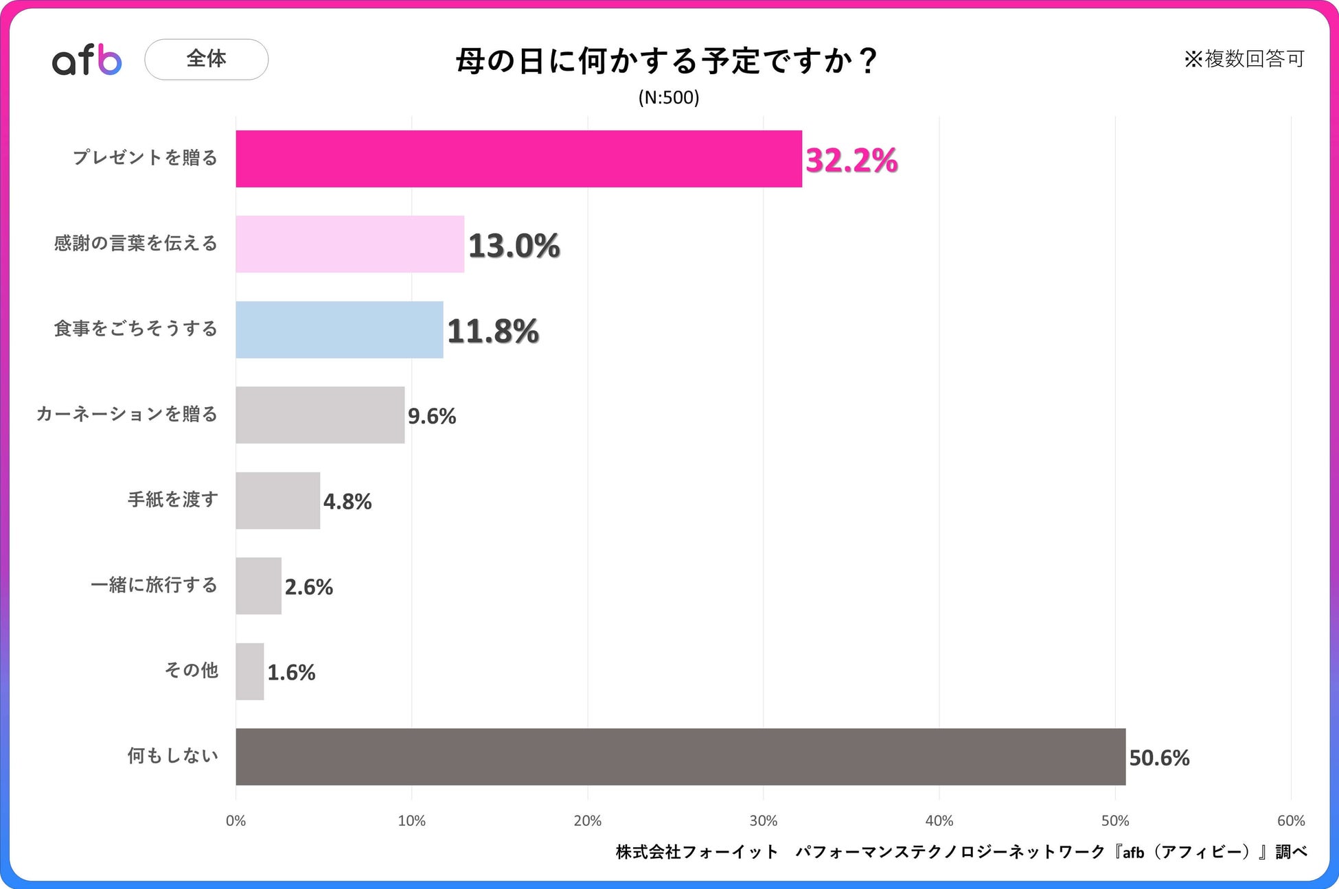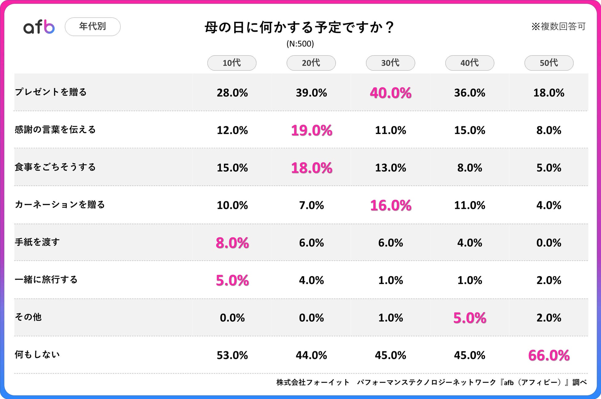 パフォーマンステクノロジーネットワーク「afb(アフィビー)」< https://www.afi-b.com/ >の開発運用をおこなう株式会社フォーイットは、全国の20代~60代までの男女500人を対象に母の日に関するアンケートを実施し、年代別等の特徴についてまとめました。
