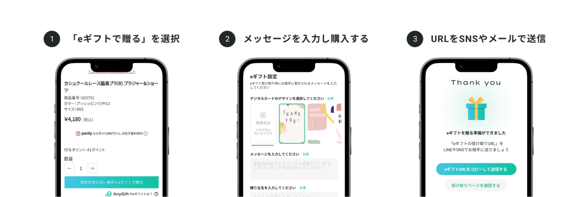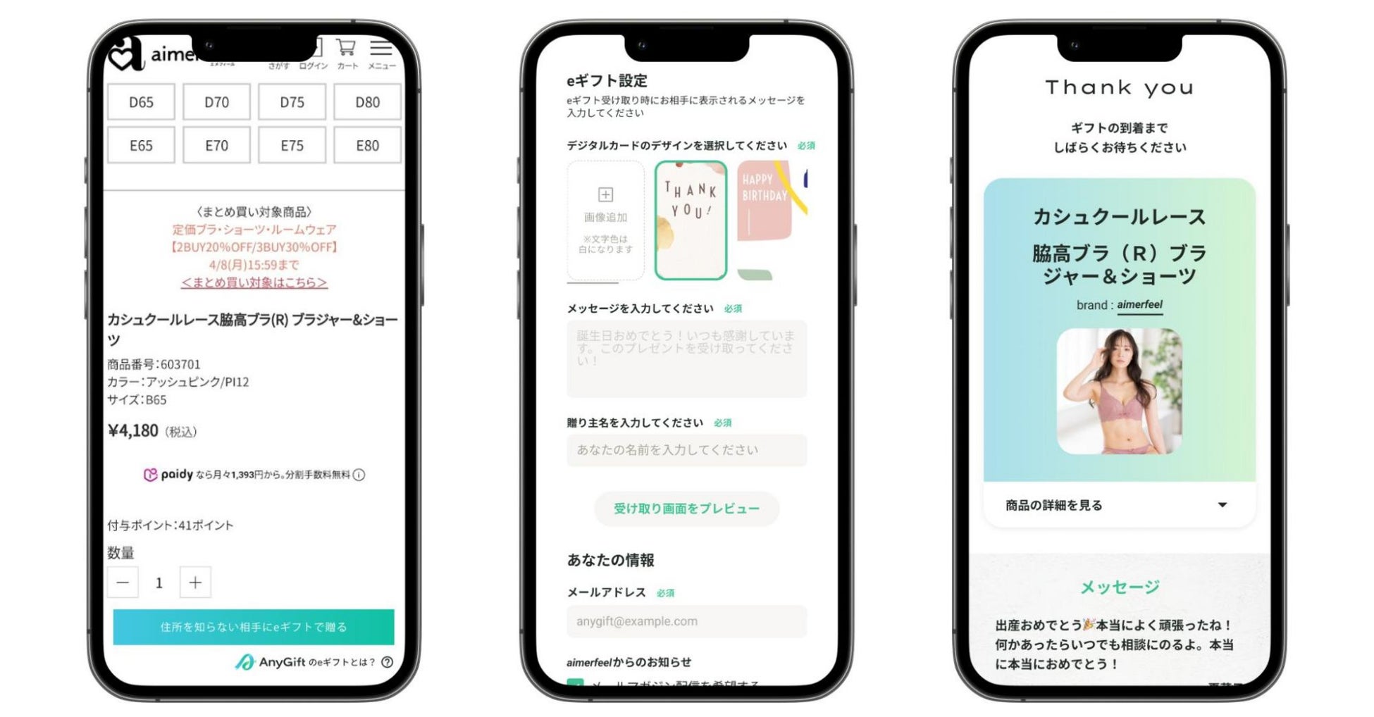 今回、当社のAnyGiftの提供により、「aimerfeel公式通販サイト」にてカシュクールレース脇高ブラ(R)や超盛ブラ(R)などの各種人気ランジェリー、キャラクターコラボや大人かわいいルームウェアがeギフトとして贈れるようになります。
