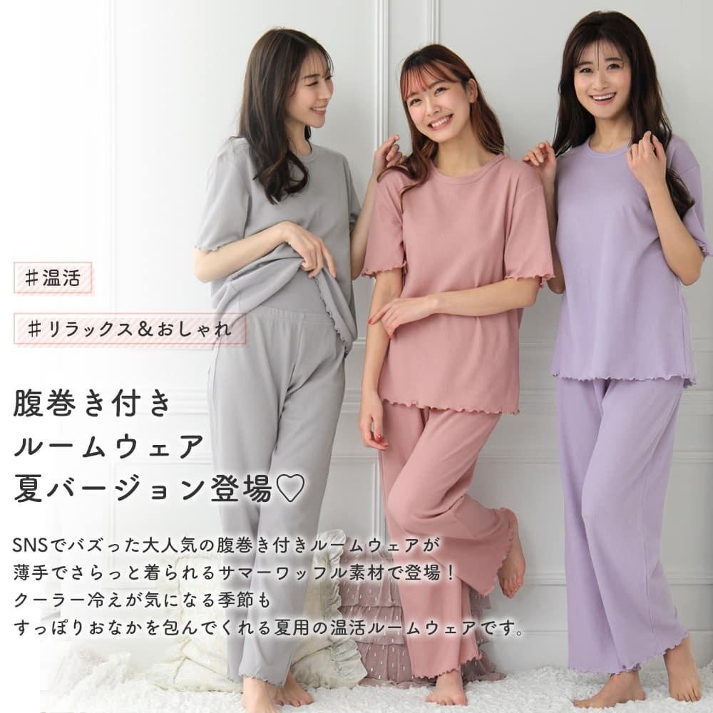 大人気の腹巻付きルームウェアの夏バージョン。薄手でさらっと着られるサマーワッフル素材の半袖とロングパンツの上下セットです。