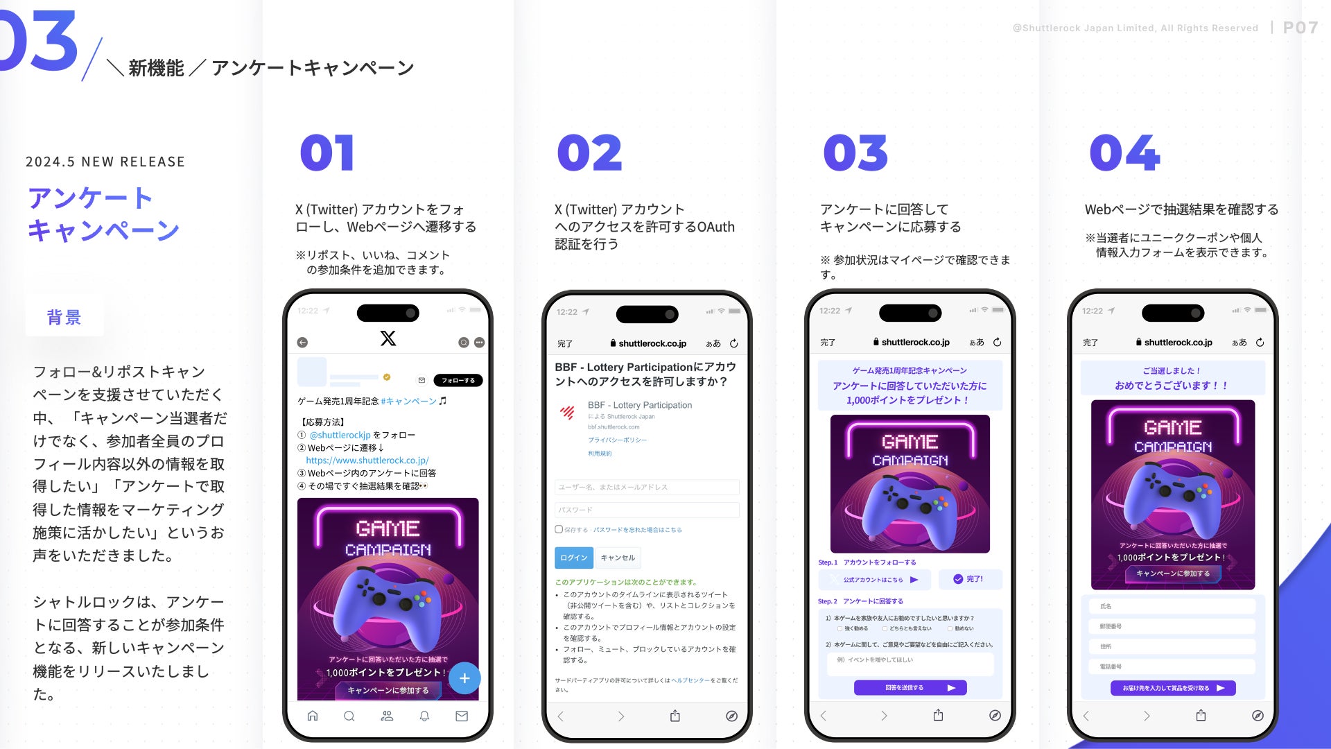 そこでシャトルロックジャパンでは、X (Twitter)からWebページへ遷移させるインスタントウィンキャンペーンツール「Shuttlerock BBF for X Web」を通して、アンケートに回答することがキャンペーンの参加条件になる機能をリリースし、キャンペーン参加者全員の年齢や性別、所在地などのデモグラフィック情報の取得を可能にしました。