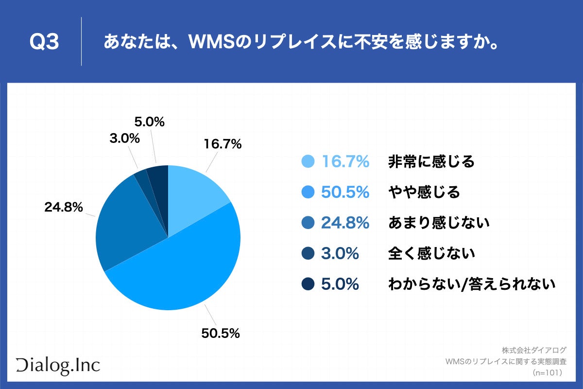 「Q3.あなたは、WMSのリプレイスに不安を感じますか。」(n=101)と質問したところ、「非常に感じる」が16.7%、「やや感じる」が50.5%という回答となりました。