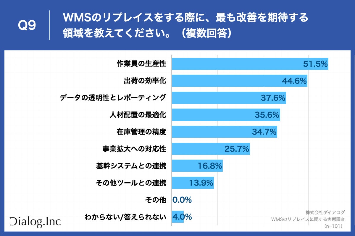 「Q9.WMSのリプレイスをする際に、最も改善を期待する領域を教えてください。(複数回答)」(n=101)と質問したところ、「作業員の生産性」が51.5%、「出荷の効率化」が44.6%、「データの透明性とレポーティング」が37.6%という回答となりました。