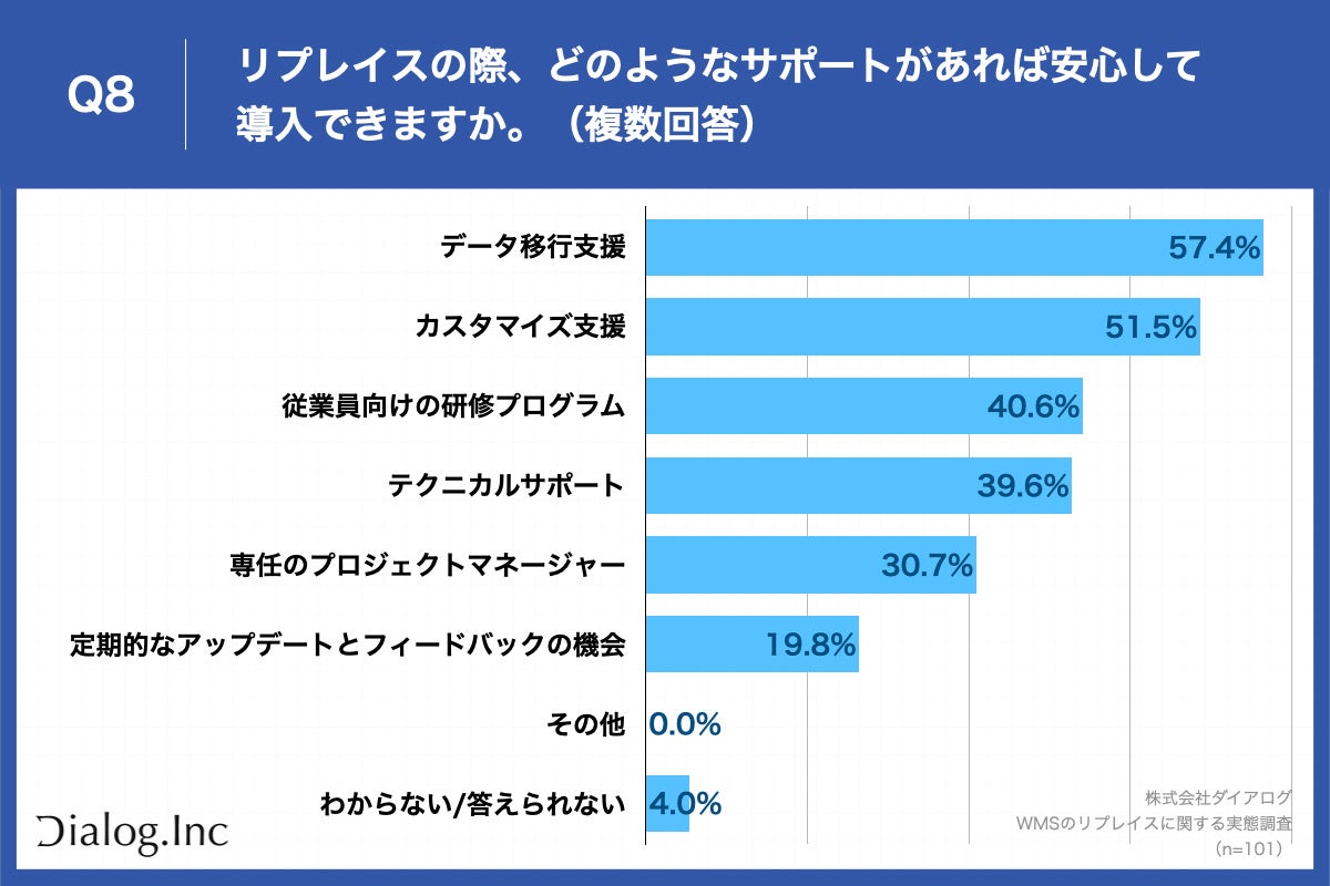 「Q8.リプレイスの際、どのようなサポートがあれば安心して導入できますか。(複数回答)」(n=101)と質問したところ、「データ移行支援」が57.4%、「カスタマイズ支援」が51.5%、「従業員向けの研修プログラム」が40.6%という回答となりました。
