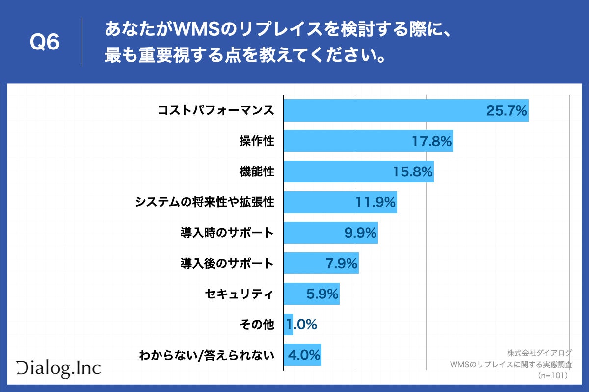 「Q6.あなたがWMSのリプレイスを検討する際に、最も重要視する点を教えてください。」(n=101)と質問したところ、「コストパフォーマンス」が25.7%、「操作性」が17.8%、「機能性」が15.8%という回答となりました。