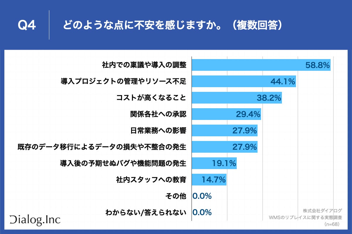 Q3で「非常に感じる」「やや感じる」と回答した方に、「Q4.どのような点に不安を感じますか。(複数回答)」(n=68)と質問したところ、「社内での稟議や導入の調整」が58.8%、「導入プロジェクトの管理やリソース不足」が44.1%、「コストが高くなること」が38.2%という回答となりました。