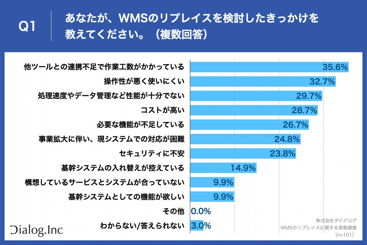 「Q1.あなたが、WMSのリプレイスを検討したきっかけを教えてください。(複数回答)」(n=101)と質問したところ、「他ツールとの連携不足で作業工数がかかっている」が35.6%、「操作性が悪く使いにくい」が32.7%、「処理速度やデータ管理など性能が十分でない」が29.7%という回答となりました。