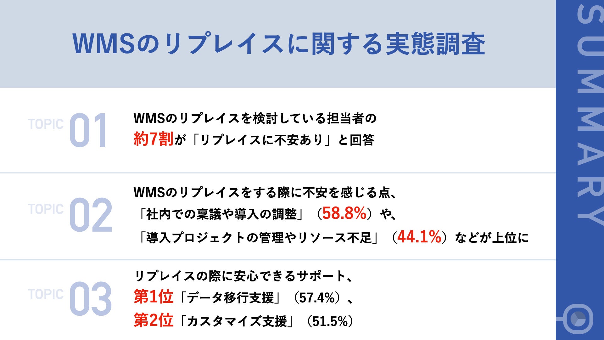 今回の調査では、WMSのリプレイスを検討する過程で企業が直面する複数の課題が浮き彫りになりました。技術の進化に伴い、企業は常に最適なシステムを追求する必要がありますが、その過程で出てくる「コスト」や「システムの連携」といった課題を克服するための解決策を模索しています。課題を解決し、企業がより効率的な運営を実現できるよう支援するWMSが求められているようです。