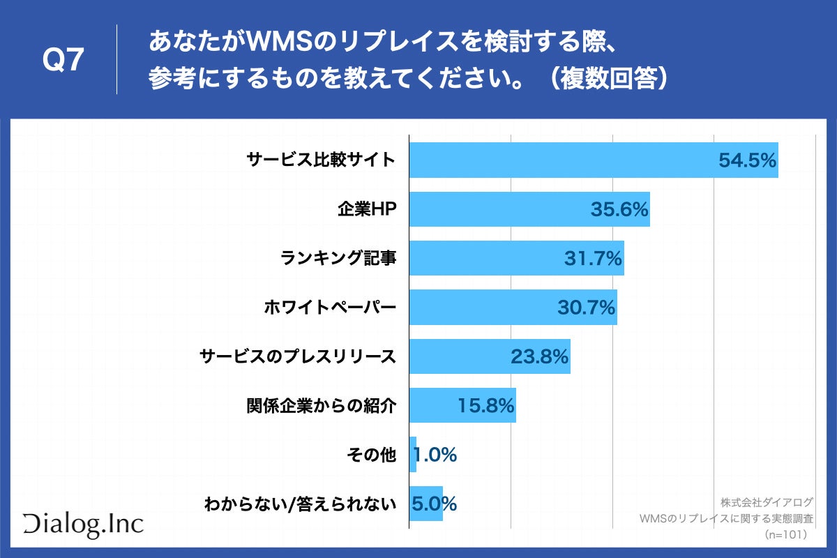 「Q7.あなたがWMSのリプレイスを検討する際、参考にするものを教えてください。(複数回答)」(n=101)と質問したところ、「サービス比較サイト」が54.5%、「企業HP」が35.6%、「ランキング記事」が31.7%という回答となりました。