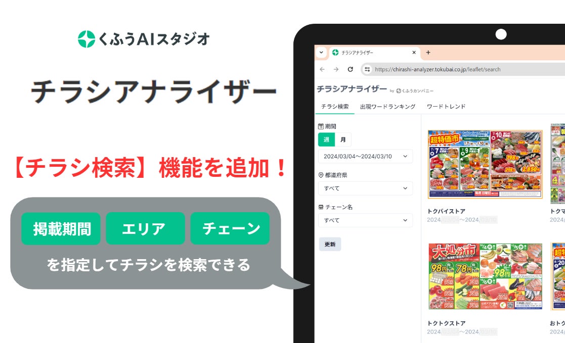 くふうカンパニーグループにおいて、AI技術を活用したプロダクトの開発・企画・運用を行う株式会社くふう AI スタジオ(本社:東京都港区、代表取締役:閑歳孝子)は、営業・販促支援ツール「チラシアナライザー」に「チラシ検索」機能を追加しました。掲載期間、エリア、チェーン別にチラシを検索でき、必要なチラシ情報を迅速に見つけられることで、市場分析や販促戦略の立案にかかる時間と手間を削減します。