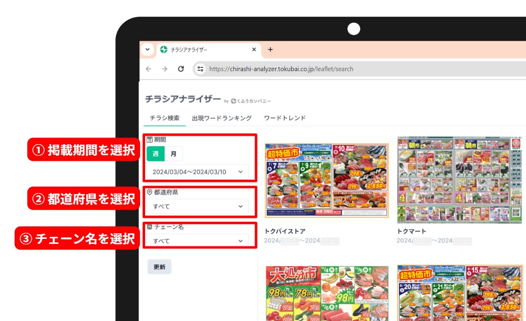 「チラシアナライザー」は、スーパーマーケットなどのチラシに掲載されている商品名や特集などの画像情報をAIを活用してデータ化し、チラシの掲載傾向の分析を容易にすることで、食品関連企業の営業・販促活動をサポートしています。これまで、特定のキーワードに基づいて関連するチラシを表示する形式でしたが、多くのユーザーから「掲載期間、エリア、チェーン別にチラシを一覧で見たい」という要望が寄せられていました。こうした声を受け、ユーザーが必要とする条件に合わせて効率的に目的のチラシを見つけることができる「チラシ検索」機能を追加しました。