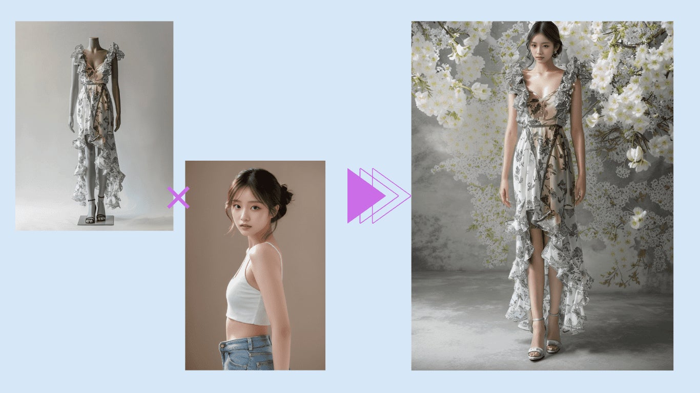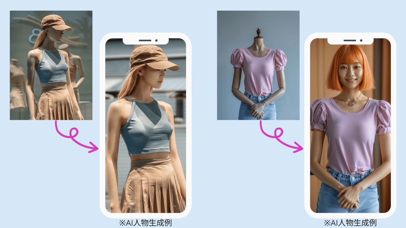 「アイファモ」は、最先端のAIを用いて、クライアントから送られてきたトルソーやマネキンに着用された商品の画像から、実際の人物が着用しているかのようなリアルなビジュアルをAIモデルを活用しながら生成します。このプロセスにより、従来の撮影が必要とする時間、人件費、そして物理的なスペースの制約から解放され、より効率的かつ経済的に従来のようなモデル着用画像を制作することが可能になります。