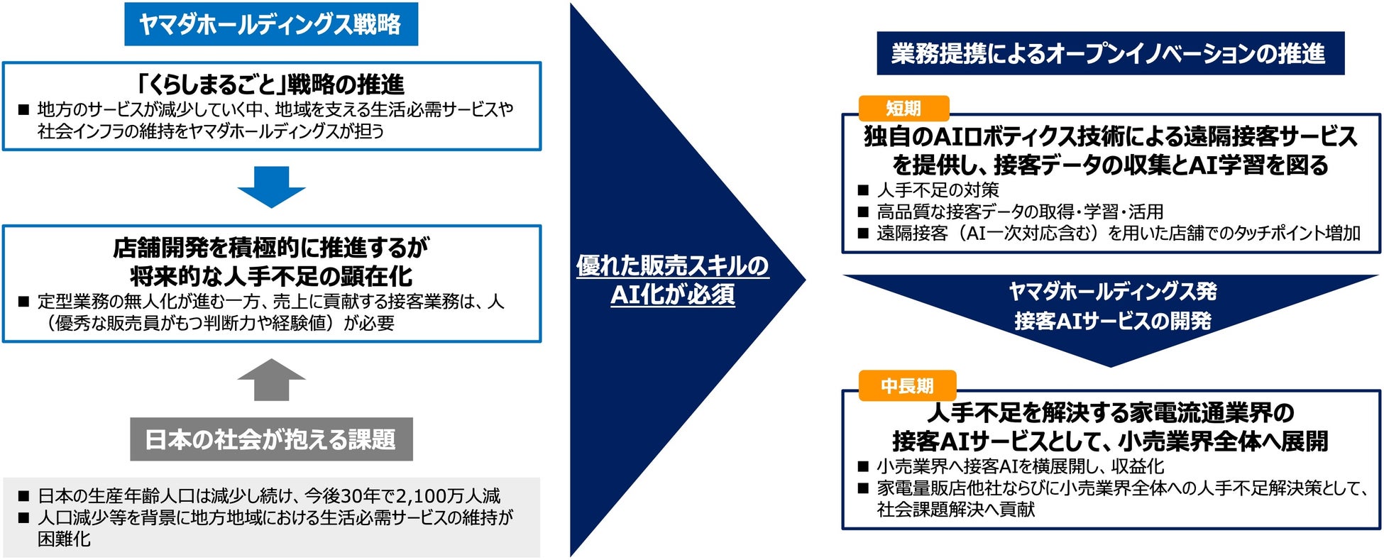 株式会社ヤマダホールディングス(代表取締役会長 兼 社長 CEO:山田 昇、以下、ヤマダホールディングス)とANAホールディングス発のスタートアップであるavatarin株式会社(代表取締役CEO:深堀 昂、以下「avatarin」)は、ヤマダホールディングスの「くらしまるごと」戦略による事業成長にあたり、家電流通業界に特化した接客AIサービスの創出に向けた業務提携の締結に合意しました。これにより、店舗開発・拡大における人手不足の課題解決に向けて接客の接点増加と品質向上を目指します。