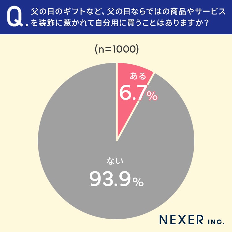 6.7%の方が、父の日ならではの商品やサービスを装飾に惹かれて自分用に買うことが「ある」と回答しています。