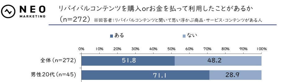 前掲した設問【リバイバルコンテンツと聞いて思い浮かぶ商品・サービス・コンテンツがあるか】にて「ある」と回答した人に対し、リバイバルコンテンツを購入、またはお金を払って利用したことがあるかお聞きしました。