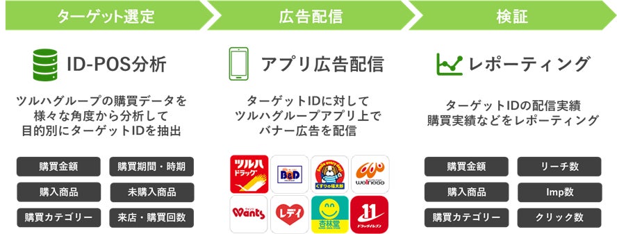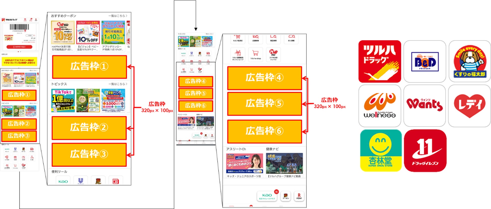 ツルハグループの公式アプリ上に最大6つの広告枠を設置。ツルハドラッグ、B&Dドラッグストア、くすりの福太郎、ドラッグストアウェルネス、ドラッグストアウォンツ、くすりのレデイ、杏林堂スーパードラッグストア、ドラッグイレブンの全8屋号、アプリダウンロード数累計897万件(2024年3月21日時点)の会員IDに紐づく「購買」という事実を基にOne to Oneのターゲティング配信を行うことができ、広告接触者の購買検証を行うことが可能になります。