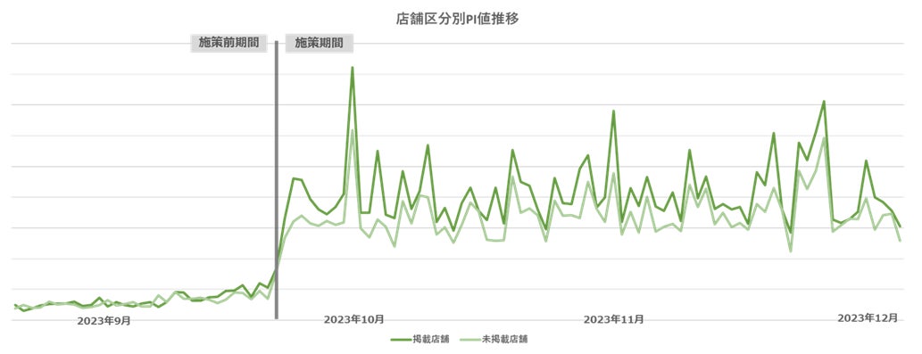 施策前は共にPI値(※)は横ばいであったが、施策期間以降は掲載店舗が上回って推移しておりサイネージ放映による購買促進の効果が見受けられた。