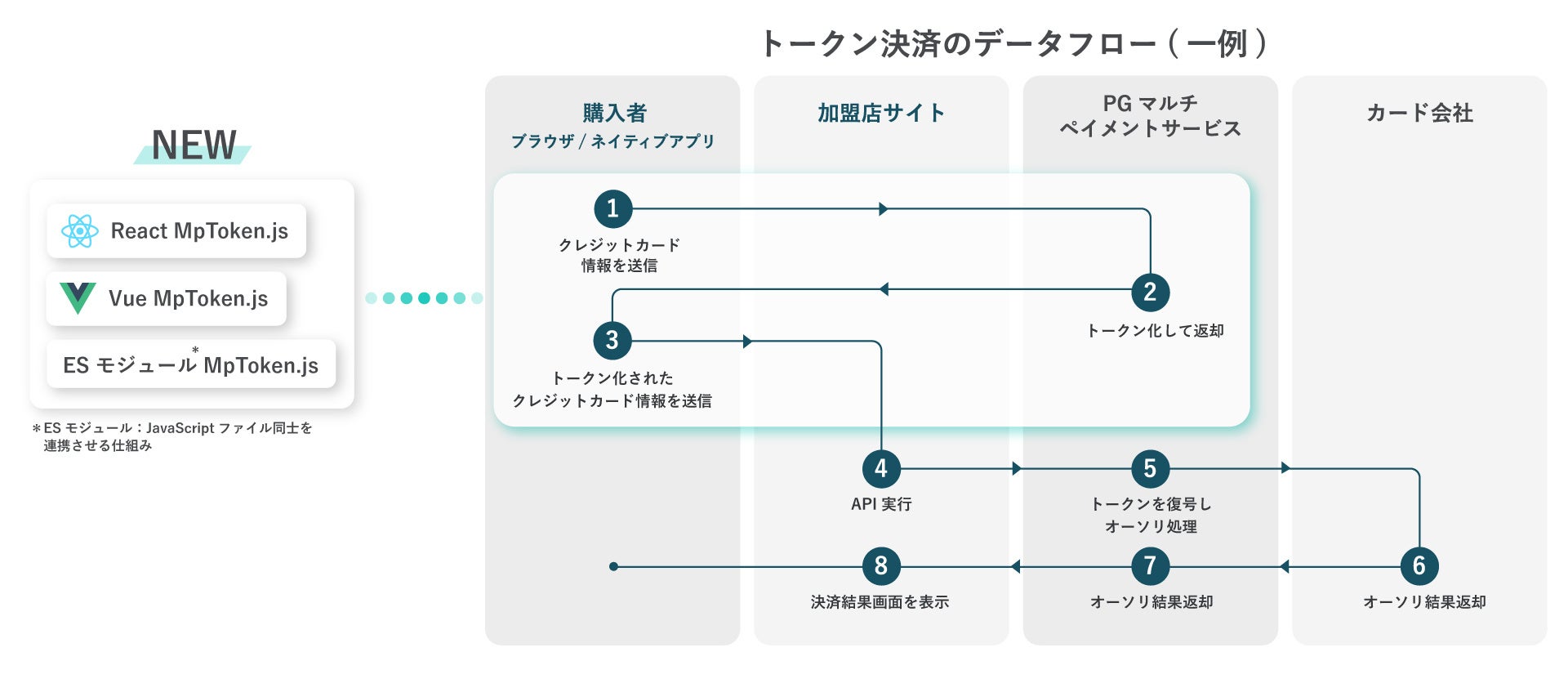 今回のアップデートでは、クレジットカード情報非通過型決済「トークン決済」をリニューアルし、新しいトークン決済をリリースしました。新しいトークン決済ではJavaScriptライブラリ「MpToken.js」をnpmレジストリに公開し、フロントエンド開発において世界的に広く使用されているReact、Vue.jsに対応しました。これにより、「PGマルチペイメントサービス」の導入事業者はエンジニアの学習コストと設計工数などを抑えて、トークン決済の実装を効率的に行うことが可能になります。