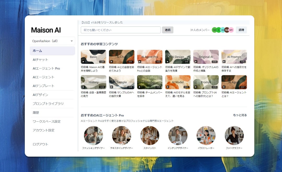 株式会社OpenFashionが提供する「Maison AI(メゾンエーアイ)」は、ファッション業界に特化した生成AI活用支援ツールです。Maison AIは、最新のChatGPTモデルGPT-4oに対応し、言語理解と画像解析の両方で高い性能を発揮します。AIエージェントProを含む多機能なツールセットを提供し、業務効率化や新規事業創出、教育用途など、様々な場面で利用されています。