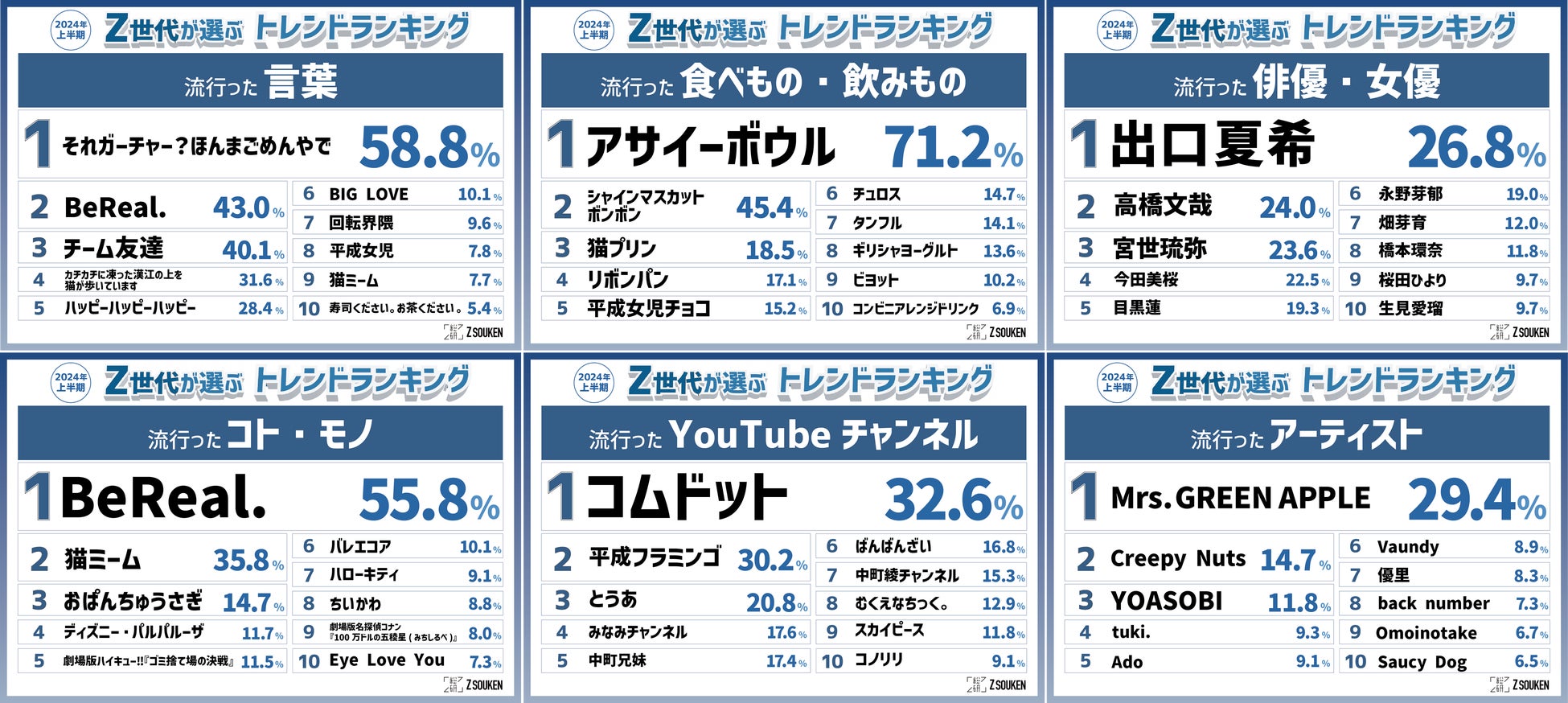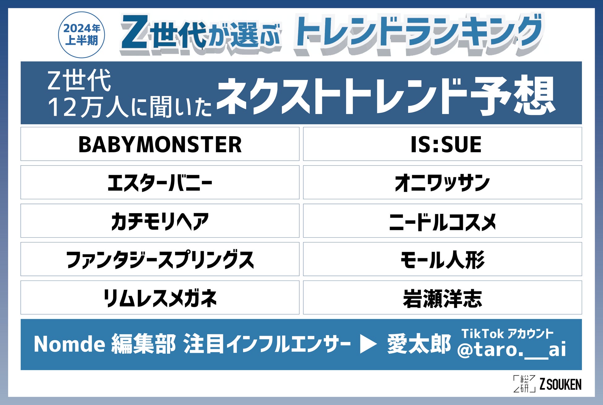 Z総研は、株式会社N.D.Promotionが運営するNom de plume(ノンデプルーム)読者でありトレンドに敏感なZ世代女子を中心としたZ総研独自のリアルZ世代コミュニティ所属のメンバーへのトレンド調査を行い、『Z総研2024年上半期トレンドランキング』を発表しました。また、Nom de plumeのZ世代フォロワー12万人に聞いた編集部セレクトの「2024年下半期ネクストトレンド予想」も同時に発表しました。