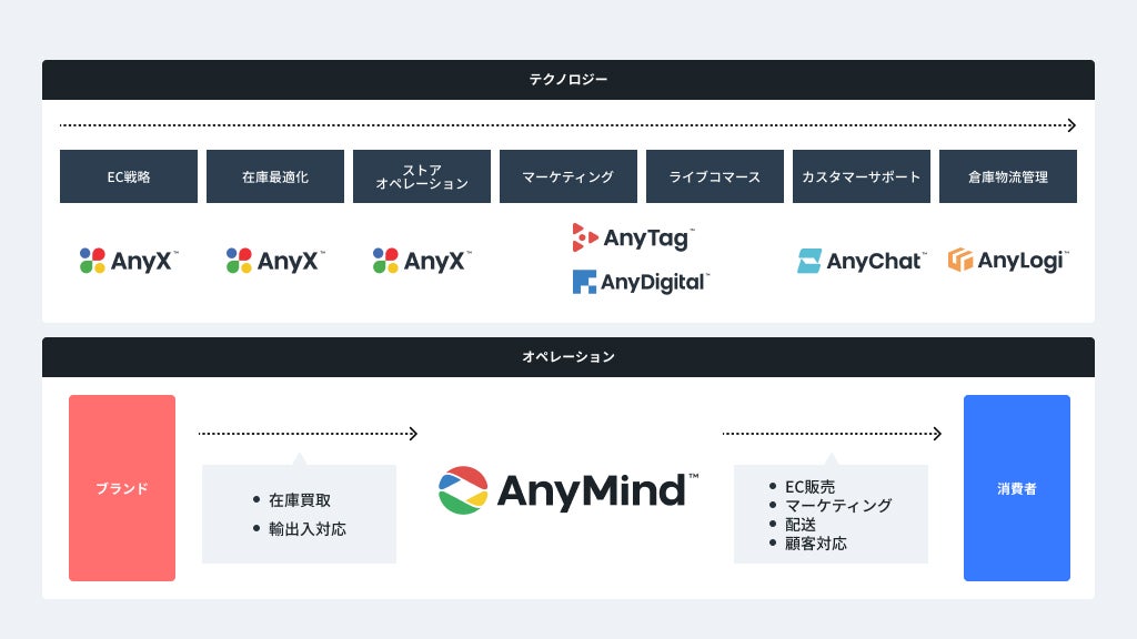 当社のテクノロジーやローカルネットワークを活用し、越境EC領域に関わる業務を包括的に支援します。現地ECモール・サイトを構築し、ECマネジメントプラットフォーム「AnyX」を用いたEC運用・分析を行います。物流に関しては、グローバル物流プラットフォーム「AnyLogi」をはじめとしたプラットフォームと現地法人、ローカルネットワークを活用し、日本への輸入対応から日本国内での商品流通までをサポートします。そのほか、インフルエンサーマーケティングプラットフォーム「AnyTag」や、会話型コマースプラットフォーム「AnyChat」を活用したマーケティングやカスタマーサポートも行う予定です。