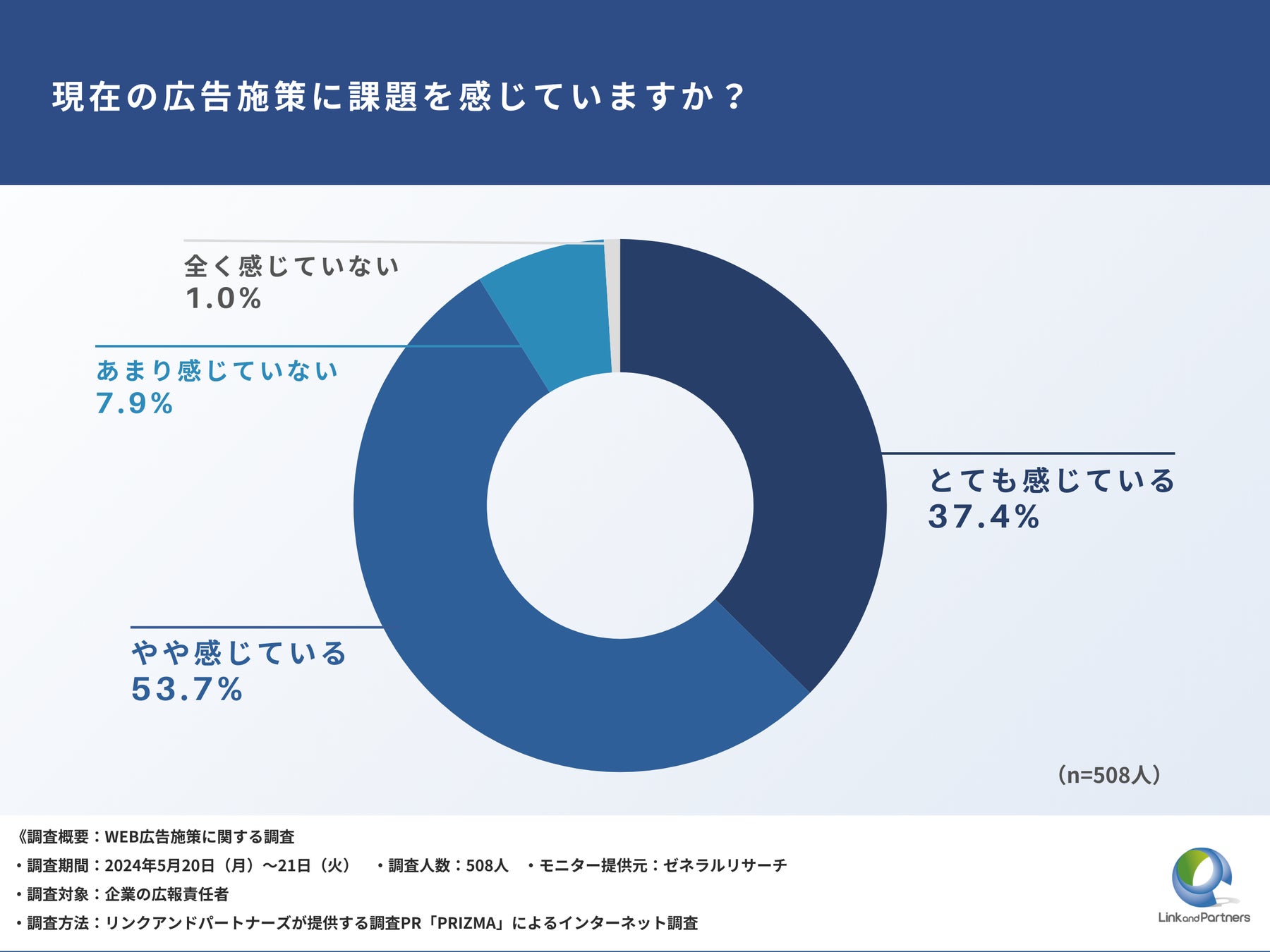 現在の広告施策への課題感としては、『とても感じている(37.4%)』、『やや感じている(53.7%)』を合わせると、9割以上と非常に多いことが分かりました。