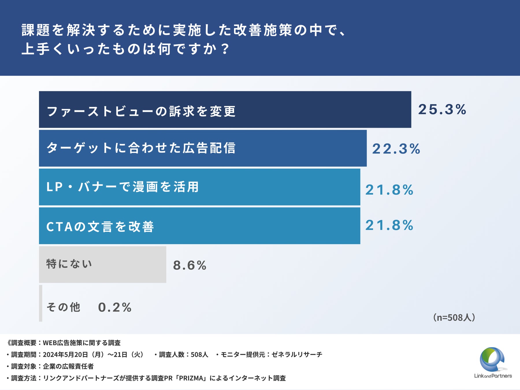 「Q5:課題を解決するために実施した改善施策の中で、上手くいったものは何ですか?」と質問したところ、『ファーストビューの訴求を変更(25.3%)』と回答した方が最も多く、次いで『ターゲットに合わせた広告配信(22.3%)』『LP・バナーで漫画を活用(21.8%)』『CTAの文言を改善(21.8%)』と続きました。