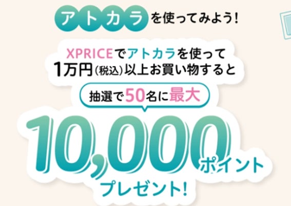 自社ECサイト(https://www.xprice.co.jp/)でアトカラを使って1万円(税込)以上お買い物いただいたお客様に、抽選で50名様に最大10,000ポイントをプレゼントするキャンペーンの実施を予定しています。詳細は追ってお知らせいたします。