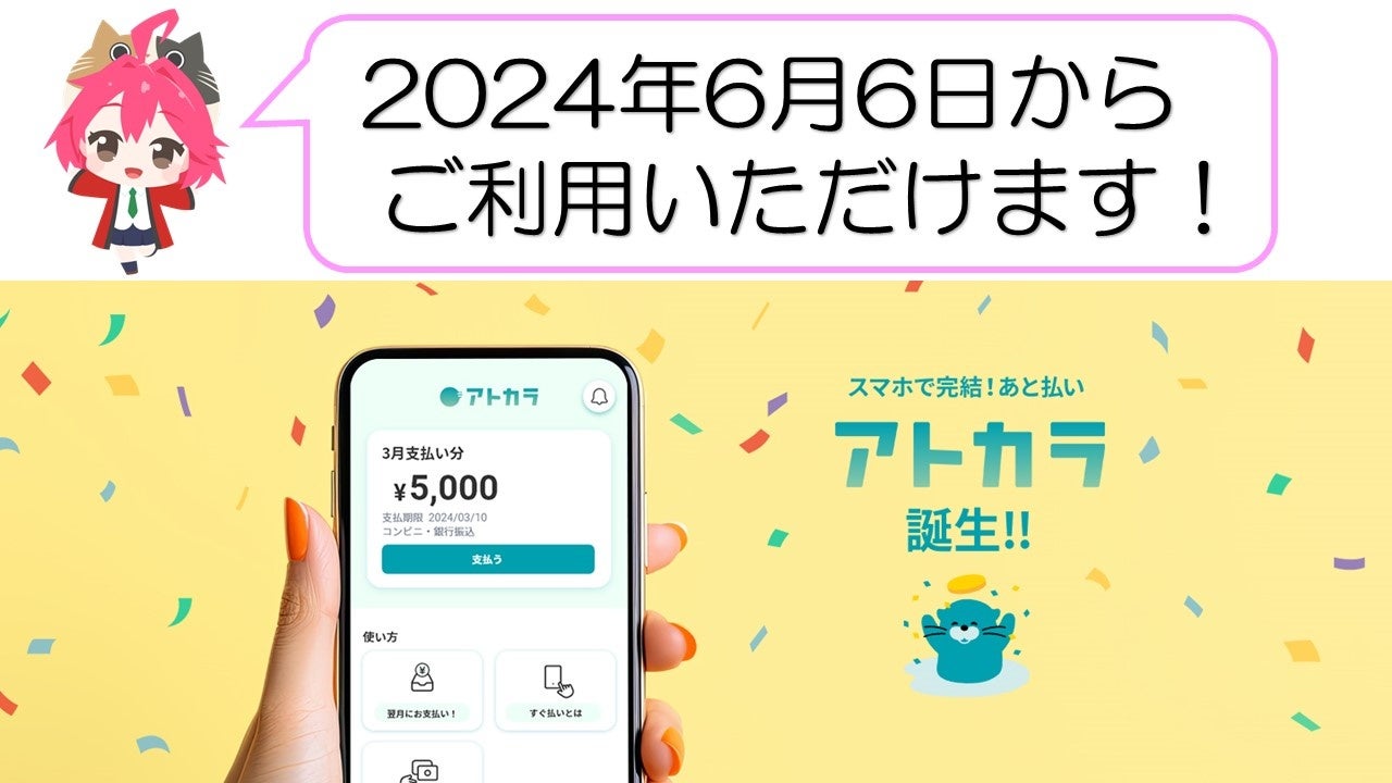 「アトカラ」は、購入者が商品を購入し受け取った後に、コンビニや銀行などで代金を支払うことができる BNPLサービスです。アプリやECなどでお買い物をする際には、クレジットカードの情報を入力することなく、「携帯電話番号」と「メールアドレス」のみを利用して決済することができます。また、「利用から請求まで完全WEB完結」かつ「締め払い」を採用していること、および対面取引でもご利用いただけることも「アトカラ」の主な特長です。