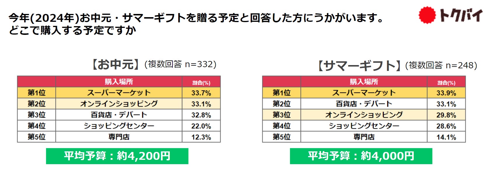- 主な購入場所はお中元・サマーギフト共に「スーパーマーケット」が最多、平均予算はお中元「約4,200円」、サマーギフト「約4,000円」