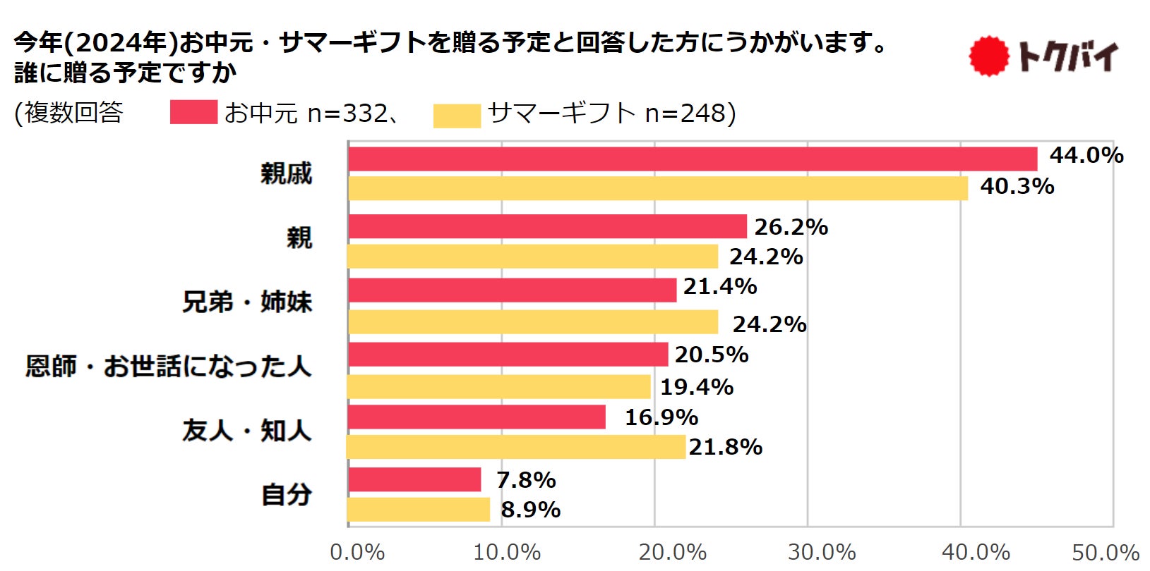 - 2024年、4人に1人がお中元を、5人に1人がサマーギフトを贈る予定と回答、贈る相手は家族や親戚に加えて「恩師」「友人・知人」も