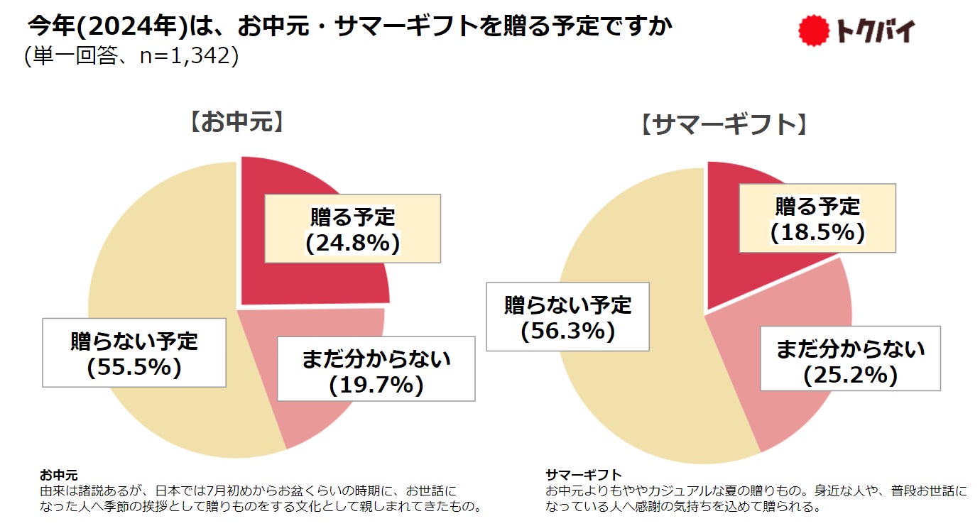 「トクバイ」ユーザーに今年(2024年)の夏にお中元またはサマーギフトを贈る予定かをたずねたところ、4人に1人が「お中元を贈る予定」と回答し、5人に1人が「サマーギフトを贈る予定」であることがわかりました。