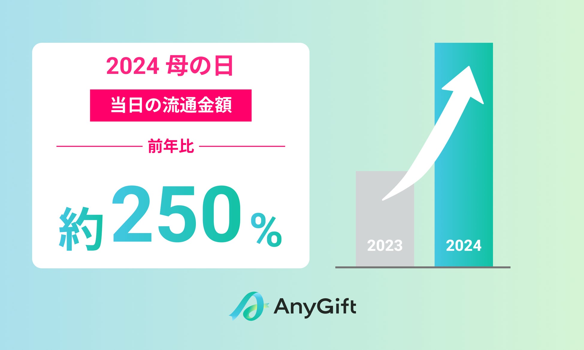 母の日当日である、2023年5月14日と2024年5月12日を比較すると、流通金額がAnyGiftの導入企業全体として、前年比約250%増加となり、1日における流通金額と利用者数の過去最多を更新いたしました。