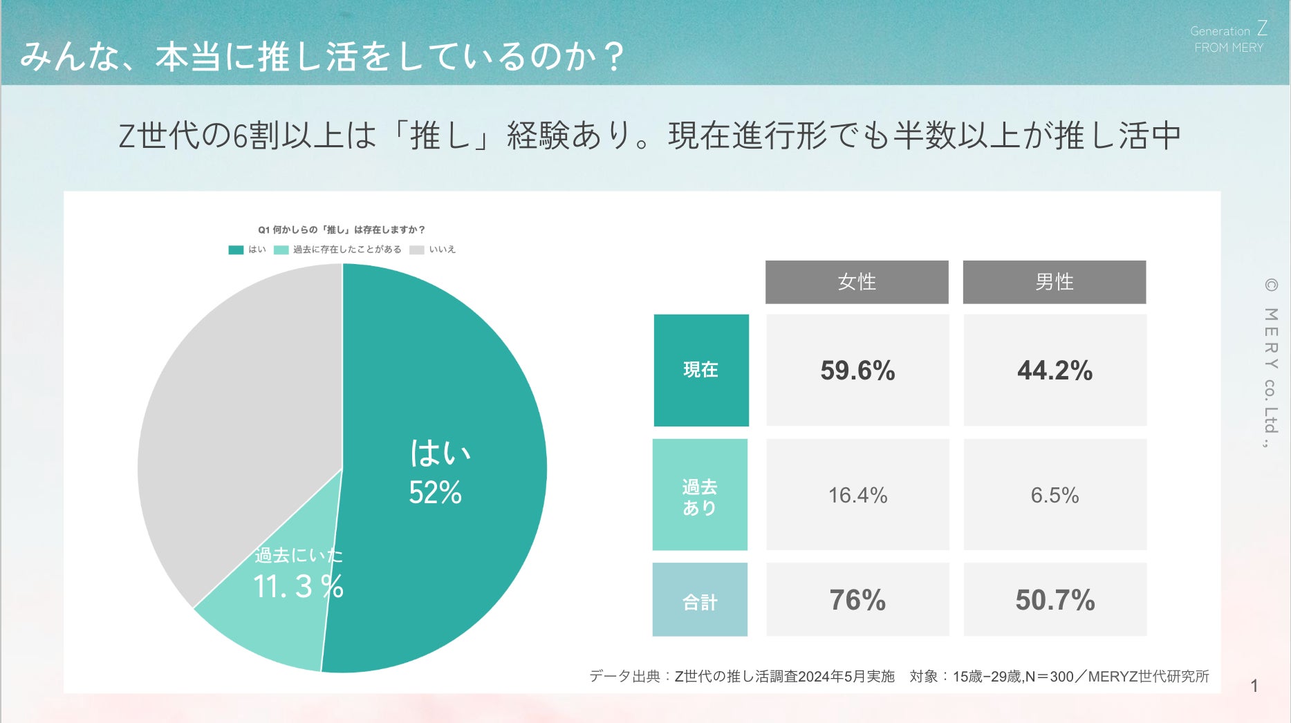 今回のアンケートでは「Z世代の推し活事情」について調査を実施。Z世代の男女300名に「推し」がいるかを聞いたところ、52%が「はい」と回答し、11.3%が「過去に存在したことがある」と回答。