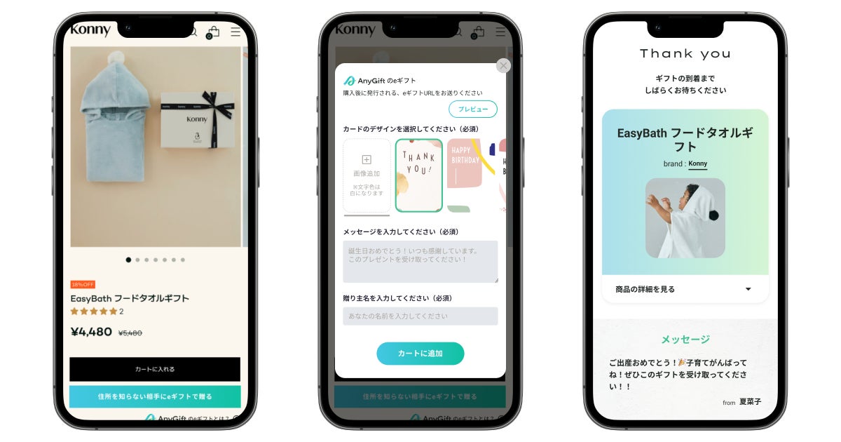 AnyReach株式会社(本社:東京都中央区、代表取締役:中島 功之祐)はKonny株式会社(本社所在地:東京都千代田区、日本法人代表:福原 裕一)が展開する「Konny(コニー)」にeギフトサービス『AnyGift(エニーギフト)』の提供を開始しました。