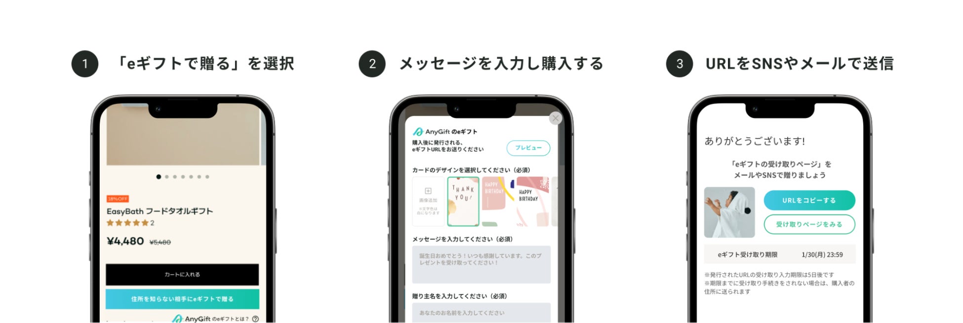 AnyGiftは、相手の住所を知らなくてもLINEやメールで贈ることができる"eギフト機能"を、ECサイトに組み込むことができるサービスです。