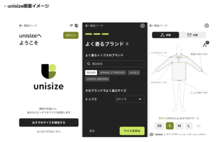 unisize(https://cl.unisize.makip.co.jp/)はネットで洋服やバッグなどを買うときに、より身体に合ったサイズを推奨するサイズレコメンドエンジンです。国内外の洋服ブランドを対象とした多量な洋服・グッズのサイズデータを有し、入力されたユーザーの身体情報、特徴を元に最適なサイズを推定する独自のアルゴリズムでレコメンドを行っております。(特許取得済み)