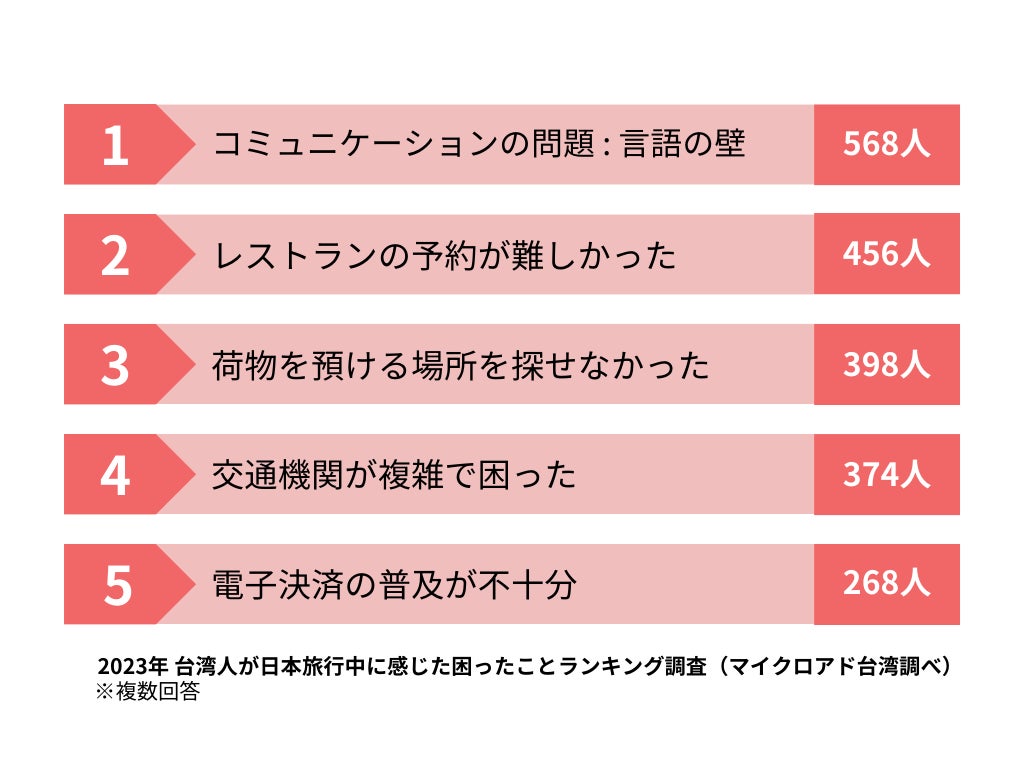 また、日本国内のさまざまな地域・場所で多言語対応が進んでいるとはいえ、訪日台湾人が日本旅行時の困ることとして「言語の壁」が多くあげられました。