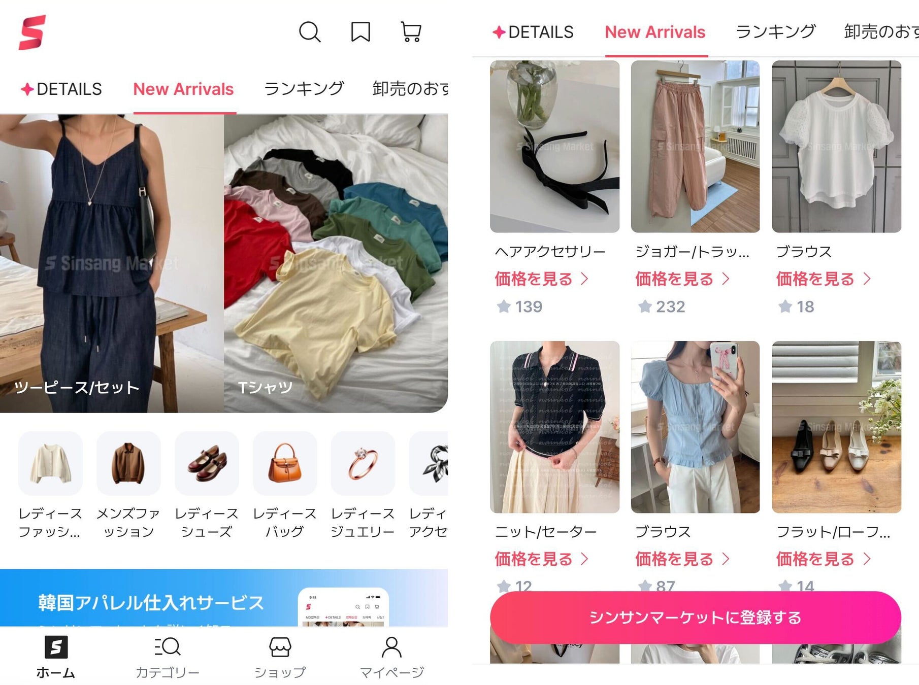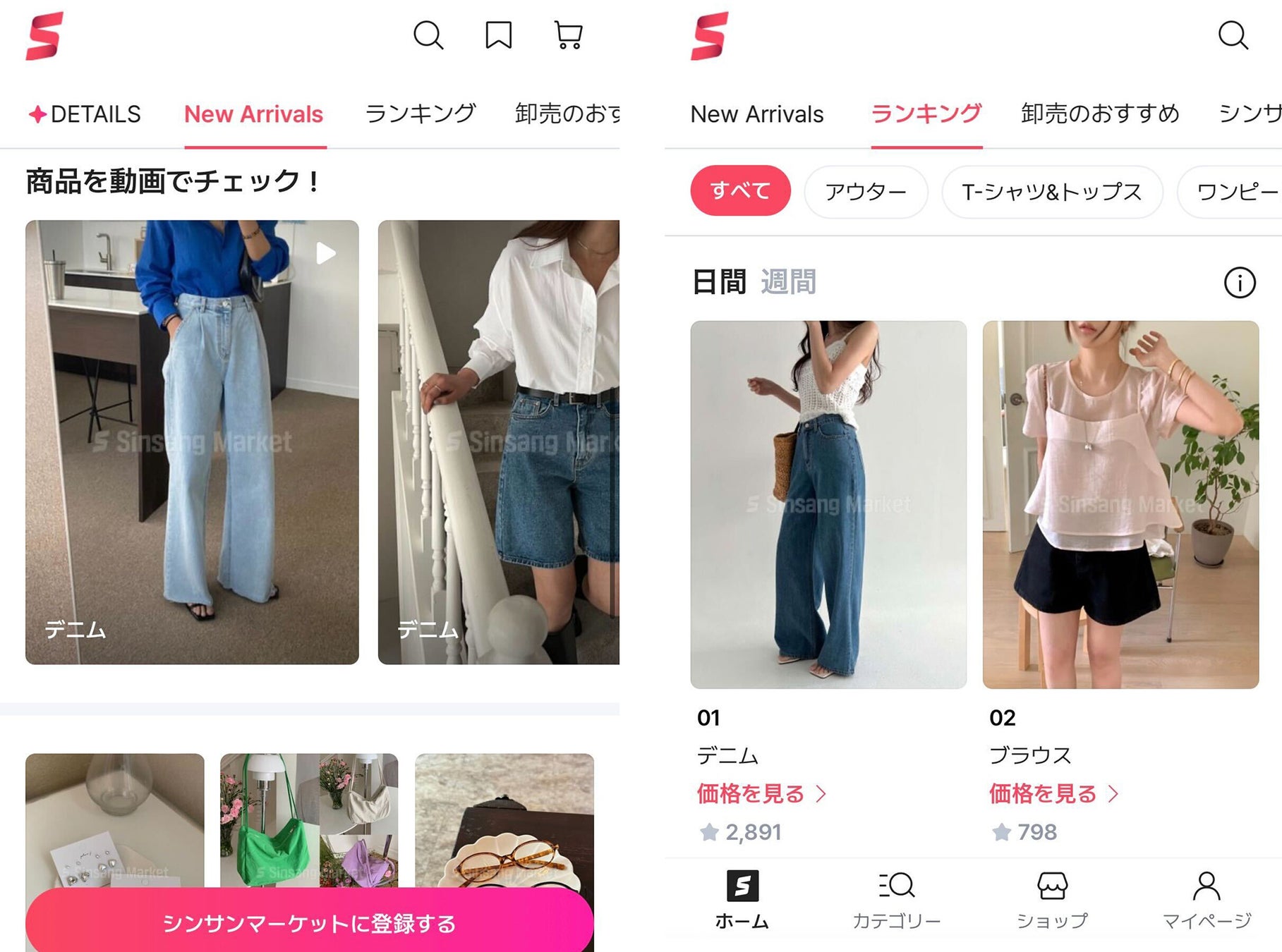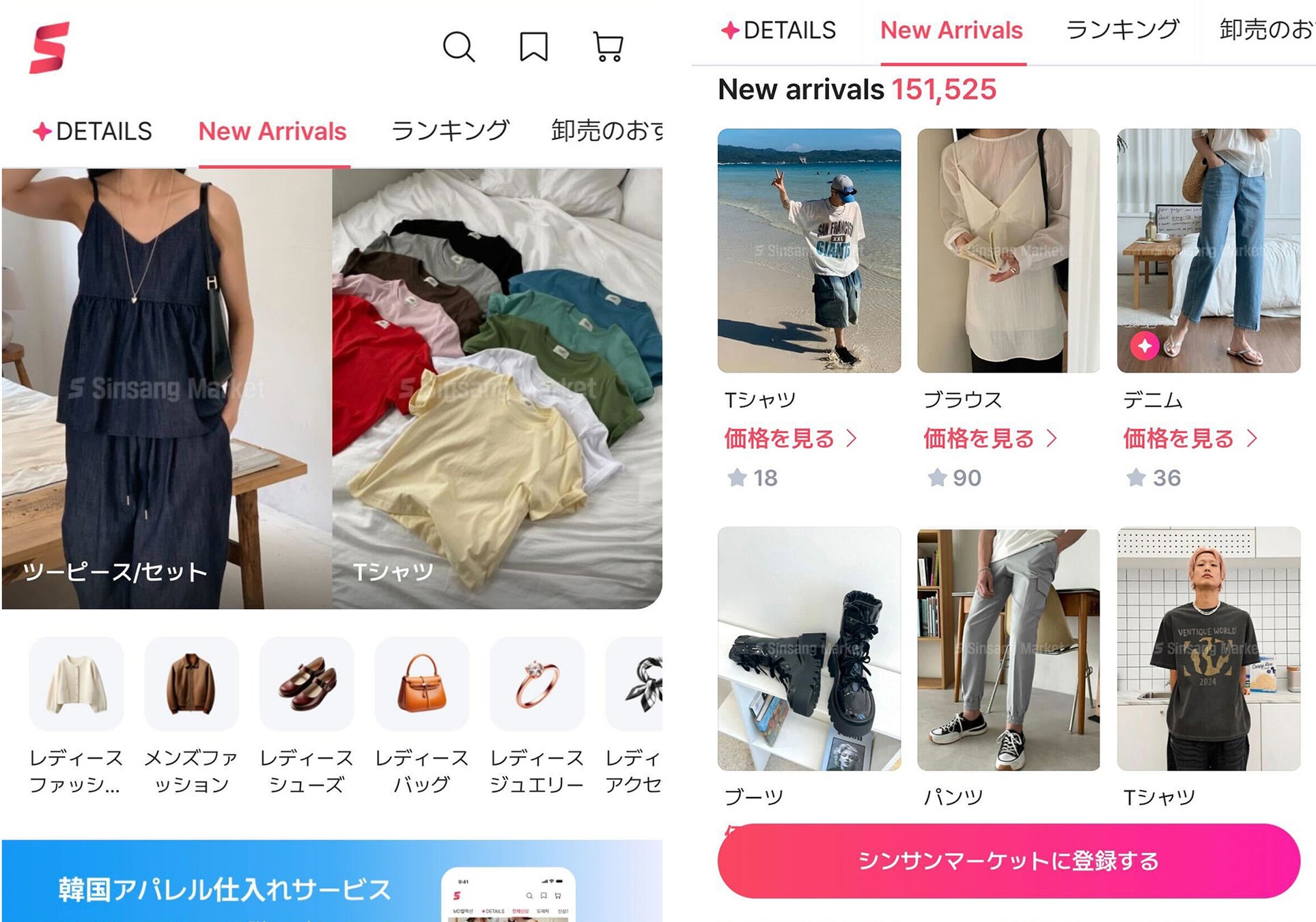 シンサンマーケットはアプリ&WEB版があり、渡韓せずとも日本から最旬の韓国ファッションを仕入れることができ、東大門市場の卸売店約80%が登録。検品・関税対応も行っており、韓国では約17万店もの小売店が利用しており、毎日12,000点の新商品がアップロードされている。アプリは日韓中で117万ダウンロードを突破、東大門必須アプリとして多くの支持を得ている。