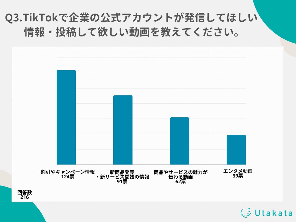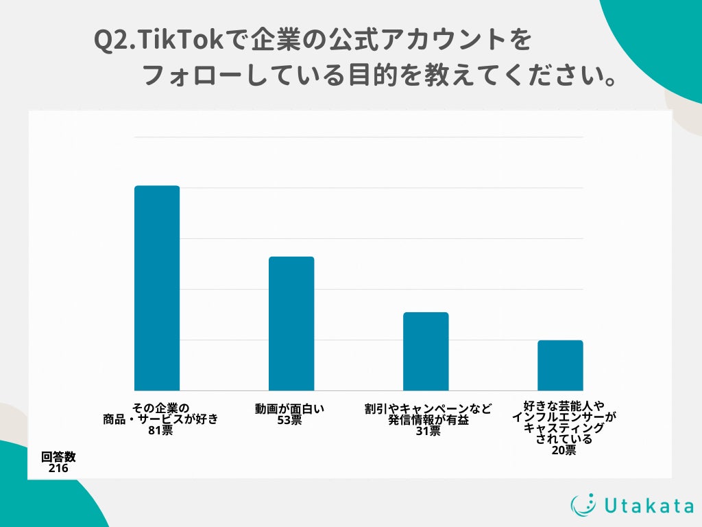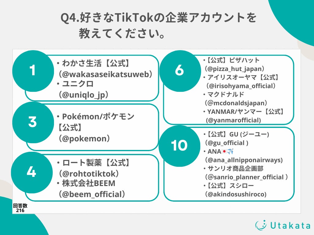 ショート動画SNSの運用やインフルエンサーキャスティングを行う株式会社Utakata(https://utakata.co.jp/)は、10代〜50代のTikTokユーザー216名を対象に、「TikTokの企業アカウント」に関する調査を実施いたしましたのでお知らせいたします。