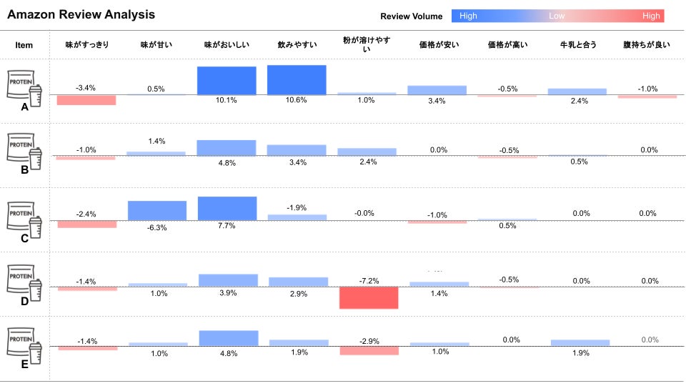 具体的には、商品の使用感に関するUSP(Unique Selling Proposition)の比較や、ポジティブ・ネガティブな評価の数値化を行うことで、データに基づいた市場での自社ブランドの評価を把握し、次の意思決定に役立てることができます。これにより、ネガティブなレビューを改善点として取り上げ、ポジティブな評価を強化することで、マーケティングのPDCAサイクルをより効果的に回すことが可能です。
