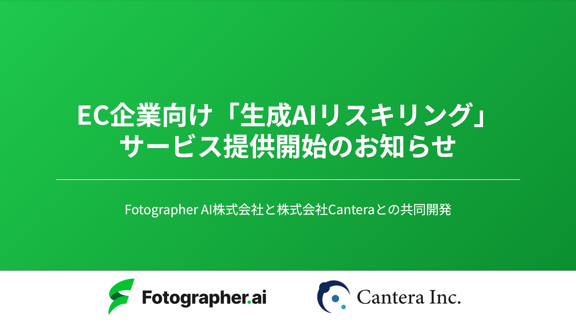 Fotographer AI株式会社(以下、Fotographer AI)と株式会社Cantera(以下、Cantera)は、EC企業向けに生成AIリスキリングサービスを共同開発し、提供開始することをお知らせいたします。本サービスは、生成AIの基礎知識から最新活用事例、業務活用方法、注意点までを網羅し、EC企業の業務効率化と競争力向上を支援することを目的としています。