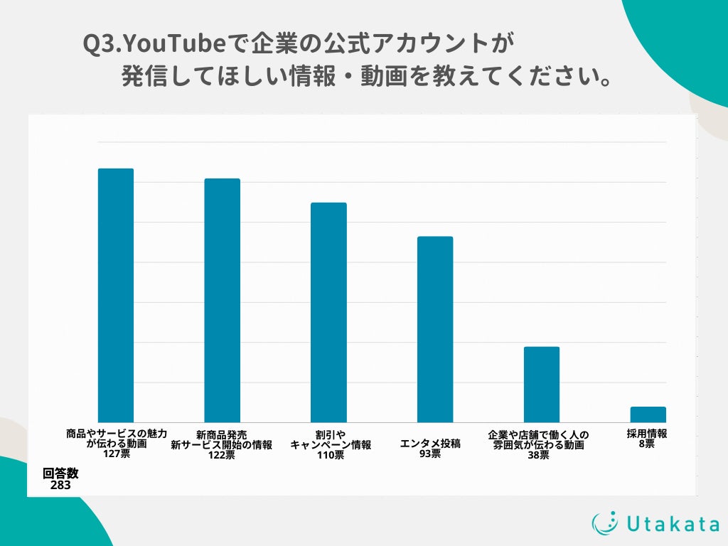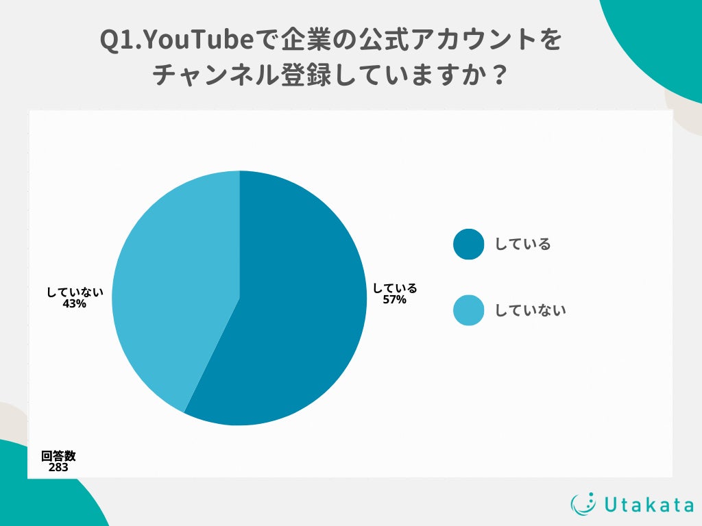 ショート動画SNSの運用やインフルエンサーキャスティングを行う株式会社Utakata(https://utakata.co.jp/)は、10代〜50代のYouTube視聴者の男女283名を対象に、「YouTubeの企業アカウント」に関する調査を実施しましたのでお知らせいたします。