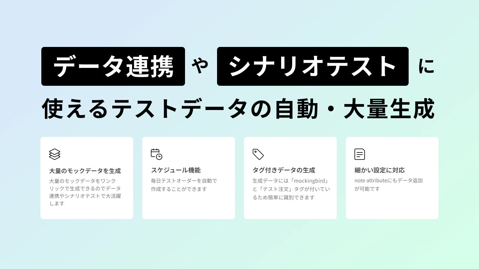 Mockingbirdは、実際のデータに限りなく近しいテストデータ(モックデータ)をワンクリックで生成できるアプリです。スケジュール機能付きで、毎日テストオーダーを作成することができます。 主には開発者向けで、データの出力・定時出力の試験を、サイトを公開する前に容易に実現することができます。