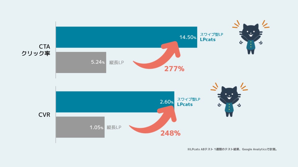 株式会社エフカフェ(本社:大阪市淀川区、代表取締役:江上 周平、以下 エフカフェ)が、InstagramやTiktokといったSNSの操作感をそのままに再現したスワイプ型のランディングページ(以下LP)が簡単に作れるLPOツール「LPcats」の提供を開始し、導入企業様のLPにおいてCVRが248%アップしました。