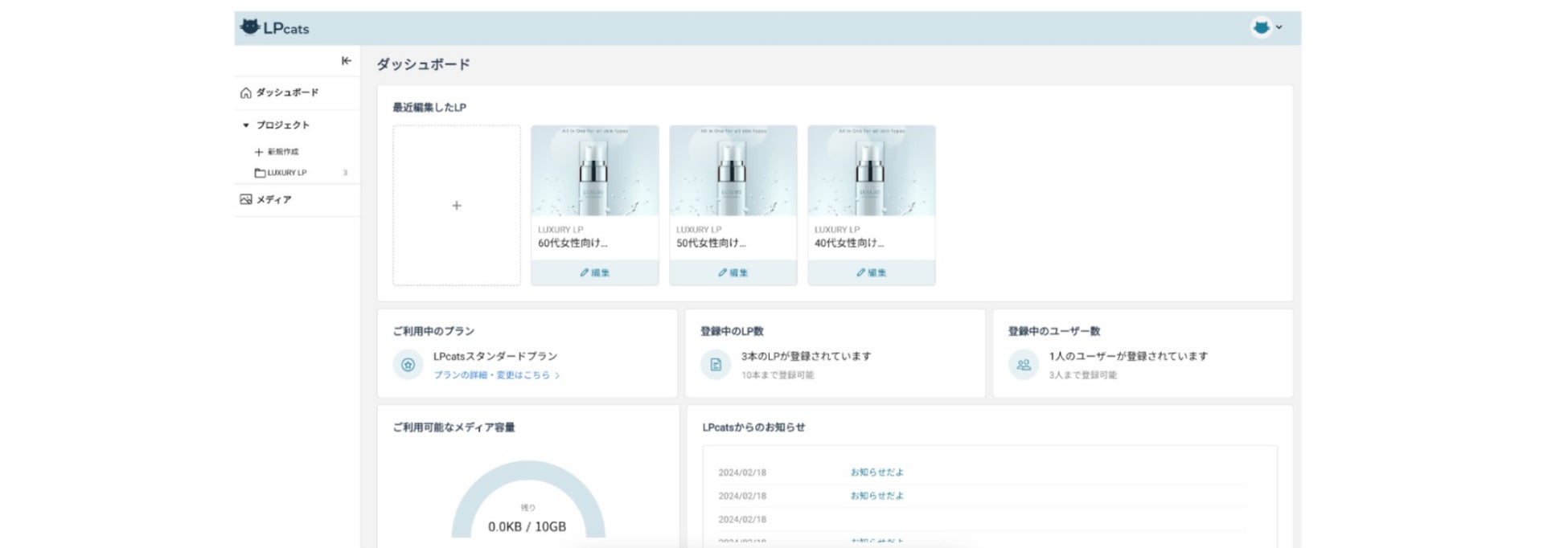 ターゲットに合わせた複数のLPや別商品、別ブランドなど御社の状況にあわせて複数のLPをLPcats管理画面で生成が可能。プロジェクト単位で管理もできます。