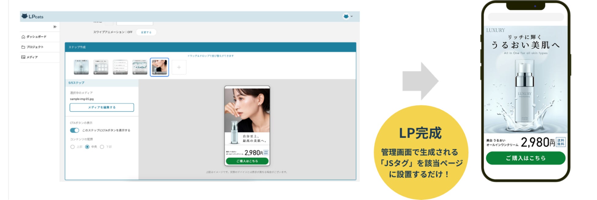 そんな中「LPcats」は縦長で読み飛ばされるLPをスワイプ型のUIにすることで「読み飛ばされない」LPを簡単に作成することができるサービスです。