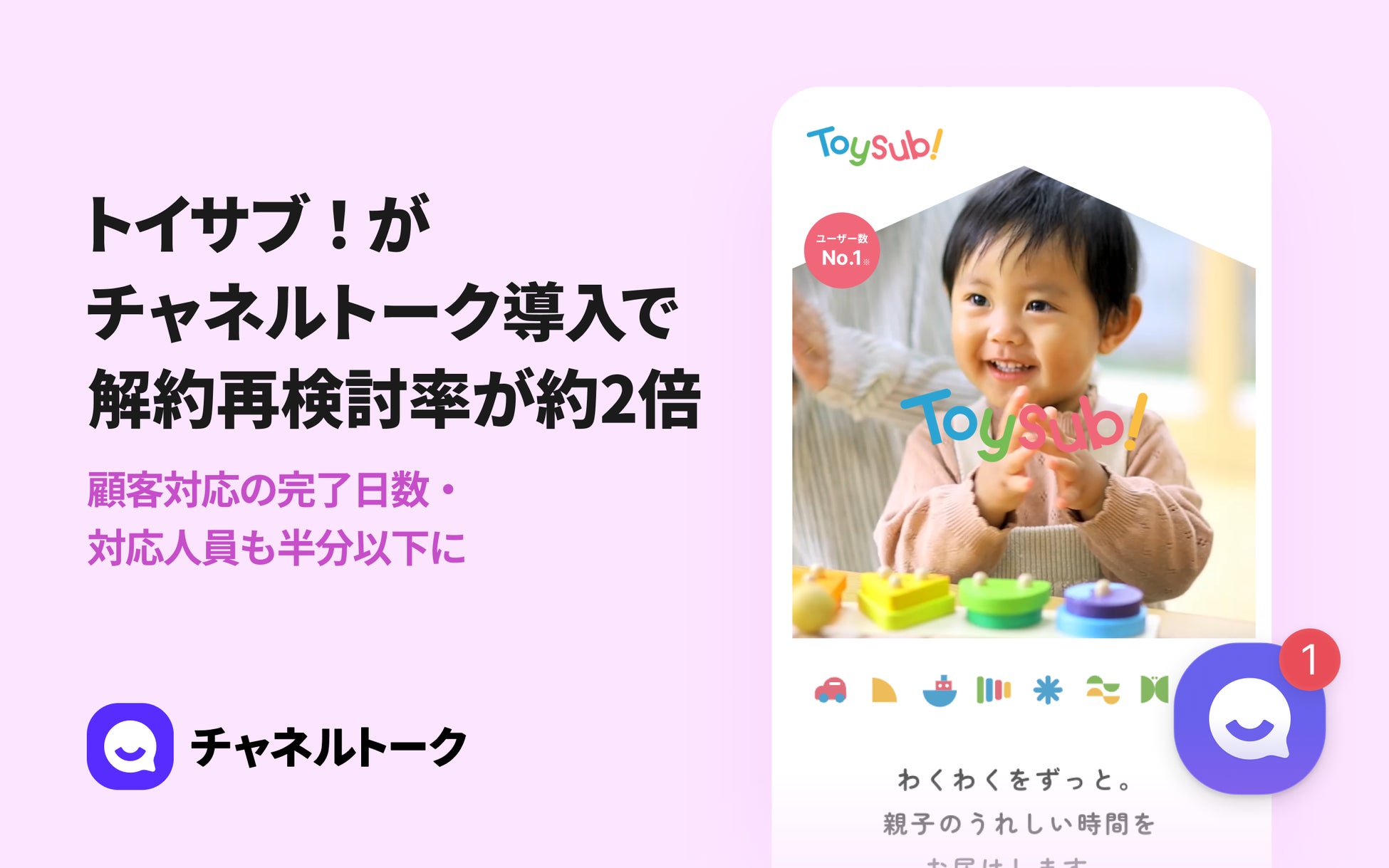 株式会社Channel Corporation(所在地:東京都中央区、CEO:玉川葉)が運営するAll-in-one AIビジネスメッセンジャーの「チャネルトーク(https://channel.io/ja)」(以下「チャネルトーク」)は、株式会社トラーナ(本社 : 東京都中野区、代表取締役 : 志田 典道、以下「トラーナ」)が提供する未就学児向け知育おもちゃサブスクリプションサービス「トイサブ!」の公式サイト(https://toysub.net/)にチャネルトークを導入し、約2年間でお客さまからの問い合わせ対応業務の効率化に成功しました。解約再検討率が約2倍に改善しました。問い合わせ対応完了日数も大幅に短縮、対応工数は50%削減したことをお知らせいたします。