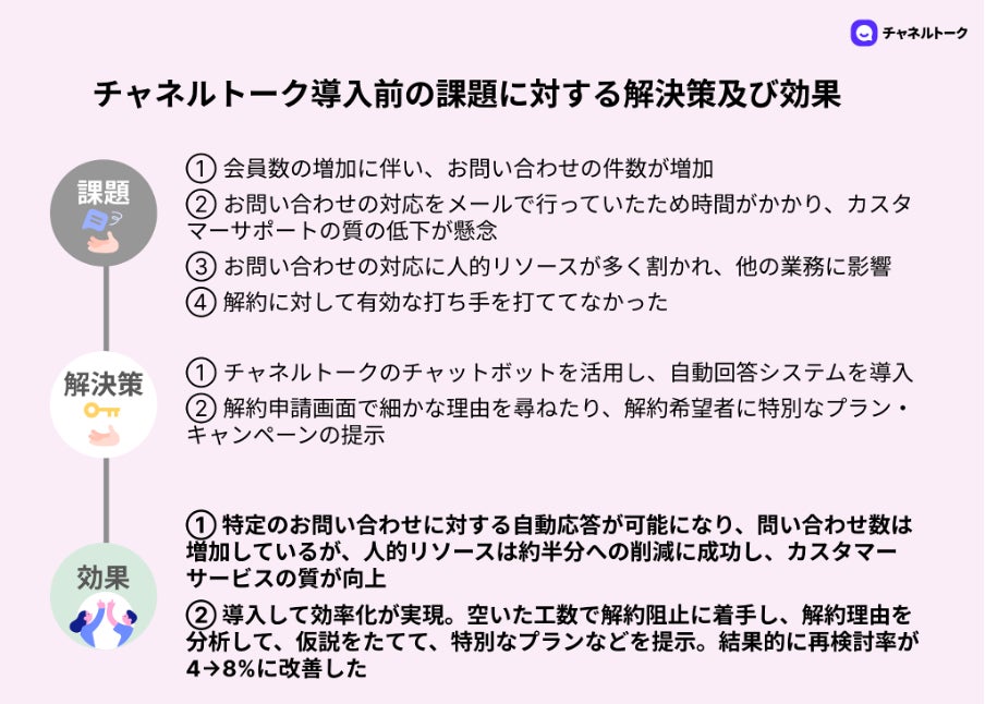 まず、サブスクリプションサービスにとって、重要となる継続率で推移しておりましたが、さらに改善するための打ち手が打てておりませんでした。チャネルトーク導入後、解約申請のチャットボットの中で解約理由も聞くことができるため、例えば自宅におもちゃが増えてしまったという理由であれば送付点数の低いプランを提案したりと、お客さまの状況に合わせた提案(再検討施策)が迅速にできるようになり約4%ほどだった再検討率が約8%まで改善しました。