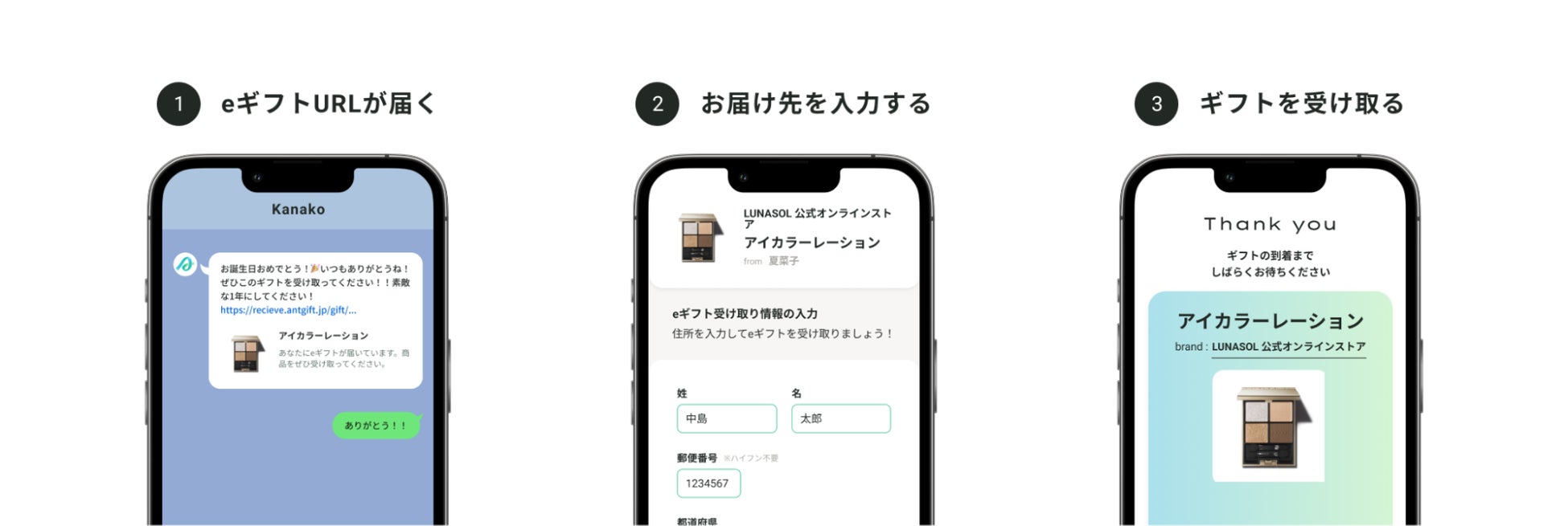 相手の住所を知らなくても「LUNASOL」の商品をLINEやメールでギフト可能に